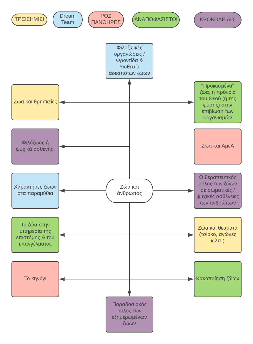 Η εργασία των μαθητών ανά ομάδες στη διατύπωση ερευνητικών ερωτημάτων απέδωσε τον χάρτη ερευνητικών ερωτημάτων που ακολουθεί. Η ανάθεση ερευνητικών ερωτημάτων σε ομάδες μαρτυρείται από τον σχετικό χρωματικό κώδικα.